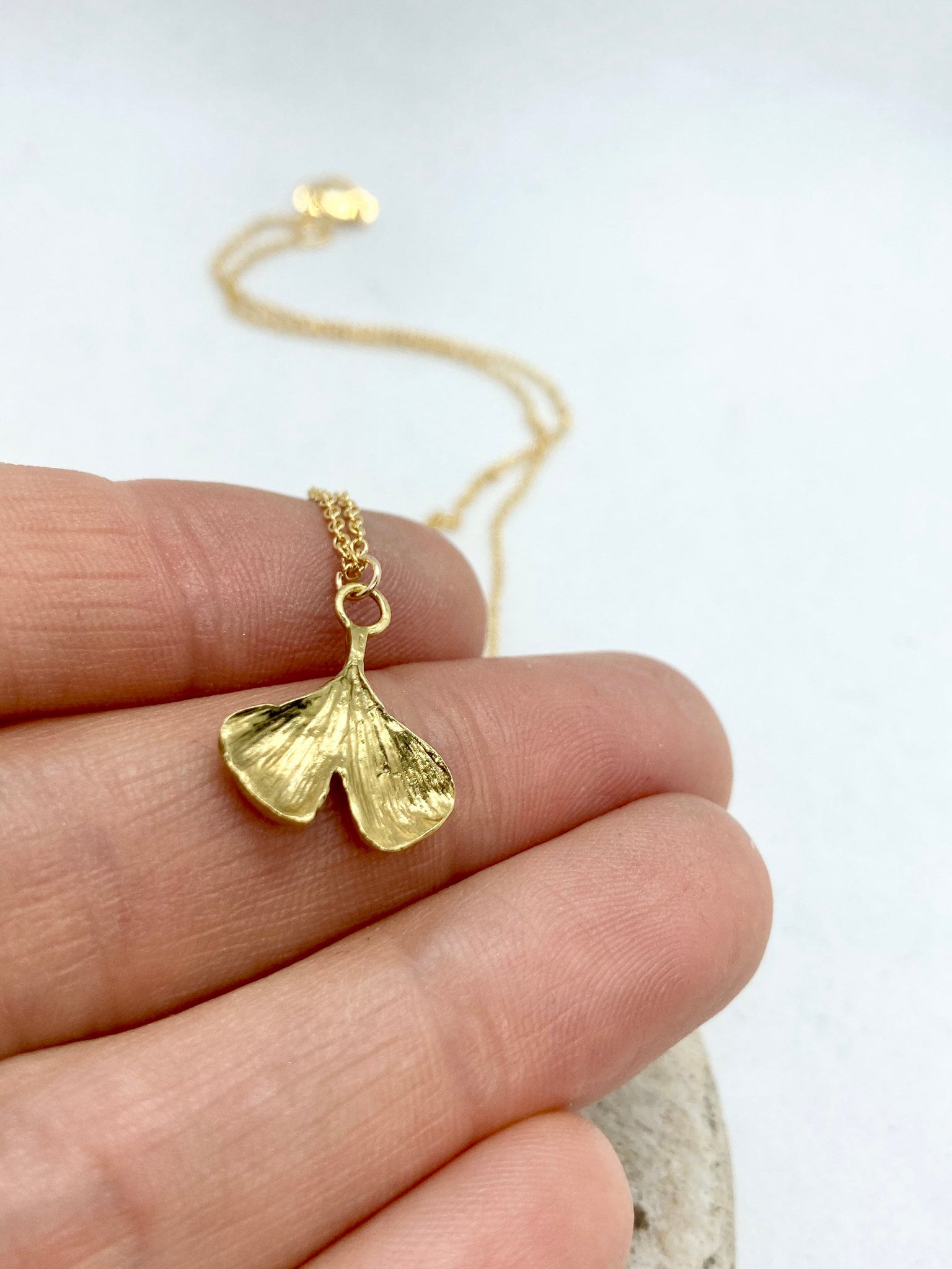 Beautiful 24ct Gold Plated Sterling Silver Ginkgo Leaf on a 18 inch 9ct Gold Filled Chain. The prehistoric ginkgo's distinctive fan-shaped leaf has carried symbolism along with its singular beauty: the ginkgo has been a symbol of longevity and endurance - It can live up to 1000 years.