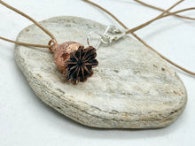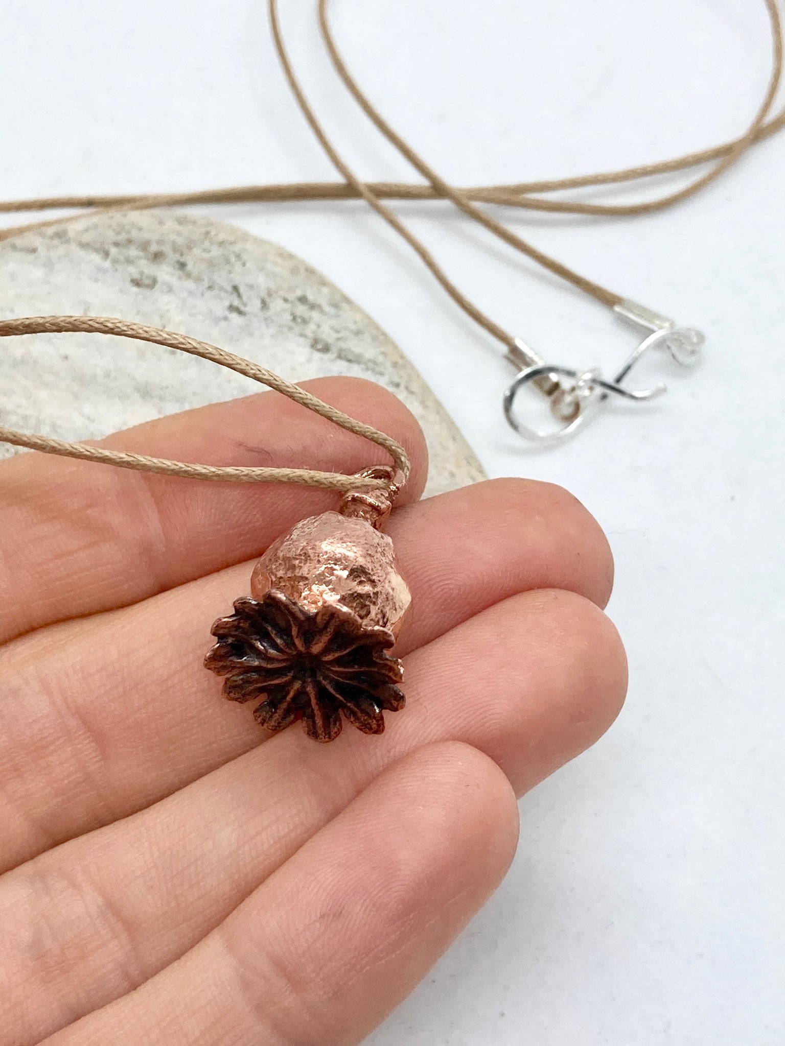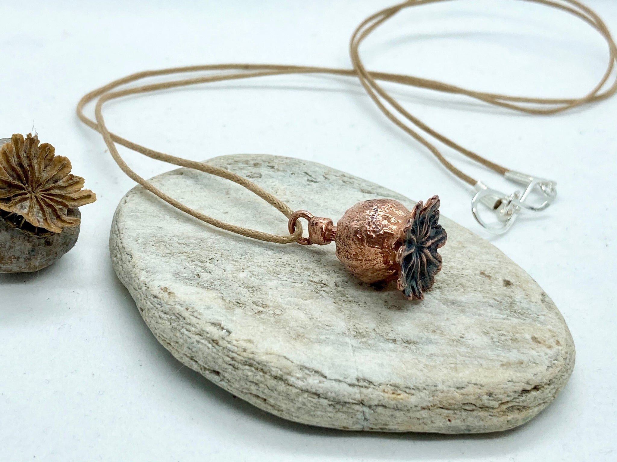This beautiful poppy seed necklace was cast from nature using a seed head from my allotment. The detail is picked out with gentle oxidation, which gives a very natural look. The cord is natural cotton and is 26” long